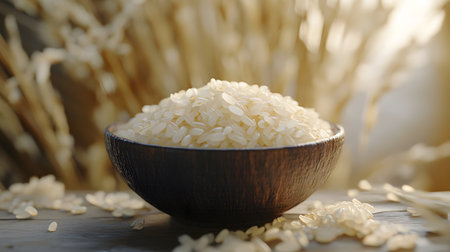 A close-up of white rice in a wooden bowl, surrounded by rice stalks, highlighting its natural beauty and culinary use.