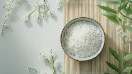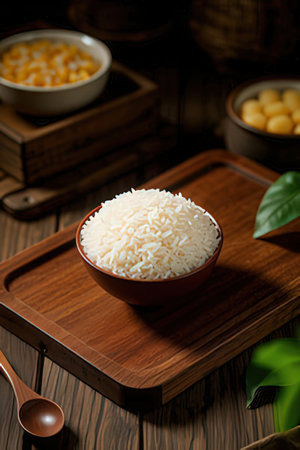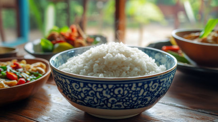 A serene image of a bowl of steaming white rice served alongside colorful dishes, showcasing a traditional Thai meal and the comfort of home-cooked food