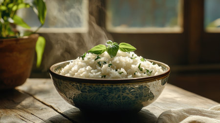 A steaming bowl of freshly cooked white rice sits on a rustic wooden table, exuding warmth and comfort. Perfect for any meal or cuisine.