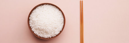 A bowl filled with fluffy, freshly steamed rice sits next to chopsticks on a gentle pastel background, creating an inviting dining atmosphere, banner
