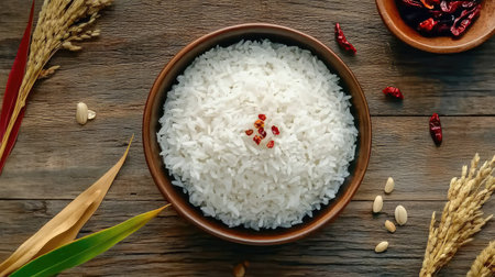 A bowl of fresh cooked white rice sits elegantly on a rustic wooden table, complemented by dried red chili and grain, showcasing natural food ingredients.