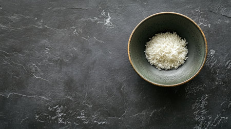 A simple ceramic bowl of rice on a dark slate surface, creating a contrast between the white grains and deep tones.