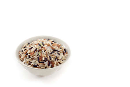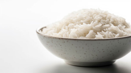 Bowl of long grain white rice, isolated on white background. Copy space.