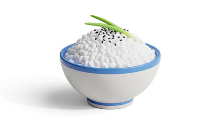 A close-up shot presents a bowl of cooked rice, topped with black sesame seeds and green onions. The bowl has a white exterior with a blue rim and base. The composition is simple, with a clean white background, creating an isolated effect. Suitable for various editorial and commercial applications.
