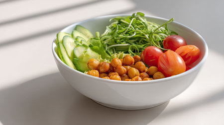 A beautiful solid bowl filled with fresh ingredients including chickpeas, cherry tomatoes, cucumber, and microgreens beautifully arranged under sunlight.