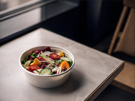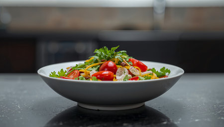 AI Generated. Fresh Colorful Salad in Glass Bowl on Marble Surface