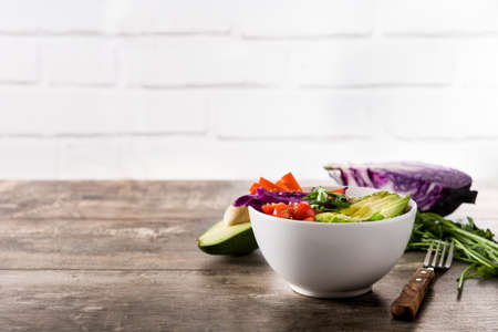Fresh and colorful salad with healthy ingredients. Nutritious vegetarian meal on wooden background. Vegan diet food concept with salad.