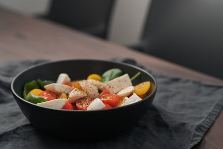 Healthy light salad with cherry tomatoes, mozzarella in black bowl on concrete surface