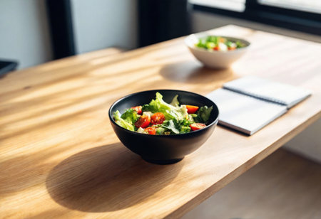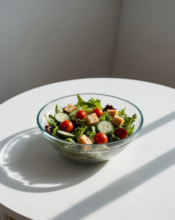 A vibrant salad bowl filled with fresh vegetables, showcasing bright colors and textures in natural light