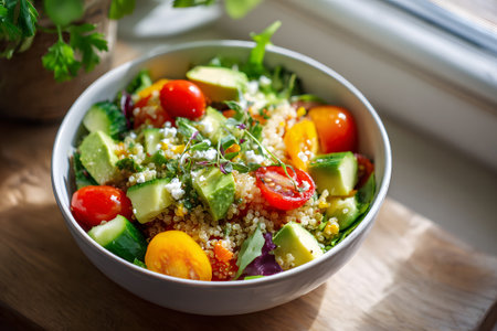 A vibrant bowl filled with quinoa, cherry tomatoes, cucumbers, avocados, and fresh herbs sits on a wooden surface. Sunlight pours through a nearby window, enhancing the freshness.