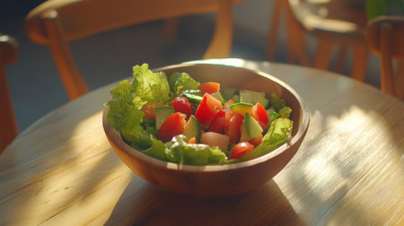 Healthy fresh vegetable salad in a rustic wooden bowl, styled on a warm wooden table for a wholesome dining experience.