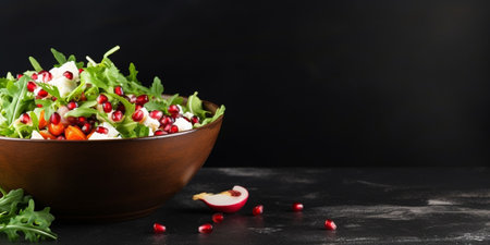 Fresh spring salad with rucola, feta cheese, red onion and pomegranate seeds in black bowl on chalkboard background with free text space. : Generative AI