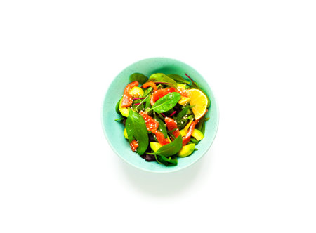 Salmon Salad with spinach and avocado in green plate on white isolated background. Concept health-conscious. Close-up, copy space. Top view.