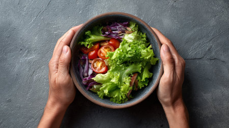Chef is holding a bowl of fresh mixed green salad with cherry tomatoes, red cabbage, and other healthy ingredients, promoting a healthy and balanced diet