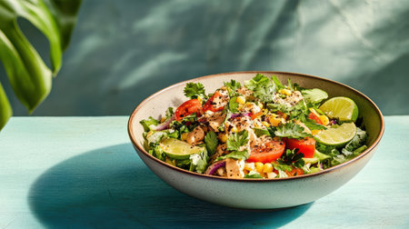 A Fresh corn salad with lime dressing, vibrant vegetables, and herbs