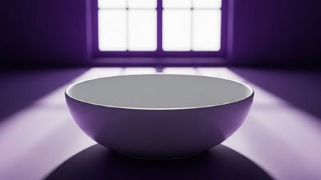 Purple bowl sits on a table in front of a window with natural light