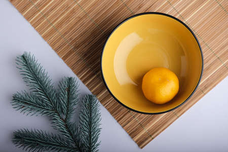 Tangerines on a white background with a branch of a Christmas tree.
