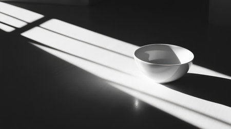 A minimalist still life photograph featuring a white bowl strikingly positioned on a dark floor. Shadows cast by natural light enhance the visual appeal, creating a serene atmosphere.