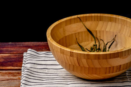 Wooden bowl with white striped dish towel and marijuana dry flower on dark wooden table