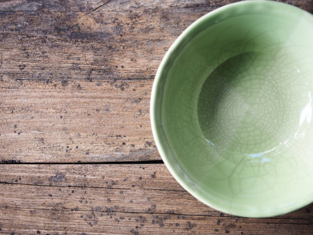 Empty green bowl on old wooden table background, top view, copy space