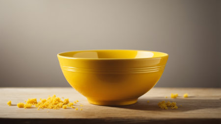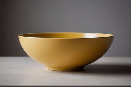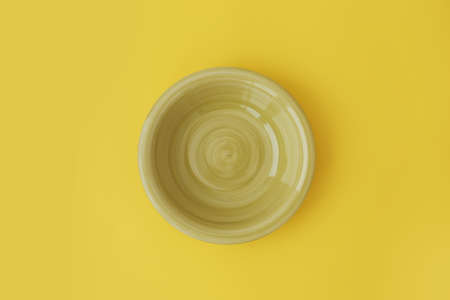 Yellow empty ceramic bowl on a yellow background. Copy, empty space for text.