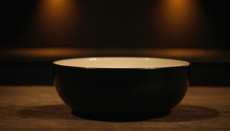 Empty black bowl on a wooden table in a restaurant. Dark background.