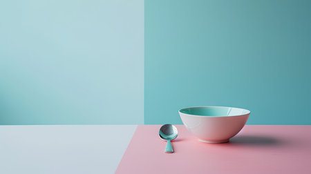 White bowl and spoon on pink and blue background. Minimal style.