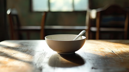 An empty white bowl rests on a rustic wooden table, bathed in soft natural light from a nearby window, creating a serene and minimalist atmosphere in the dining area.