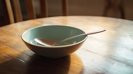 A minimalistic bowl and spoon on a wooden table capture the essence of calmness and simplicity, perfect for food and kitchen-themed projects.