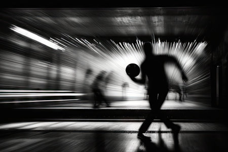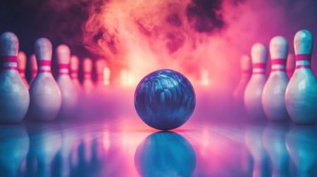 A vibrant and dynamic image showcasing a striking bowling ball poised for action amidst colorful smoke and illuminated pins, creating an energetic bowling alley atmosphere.