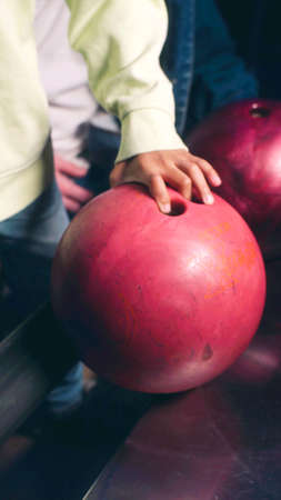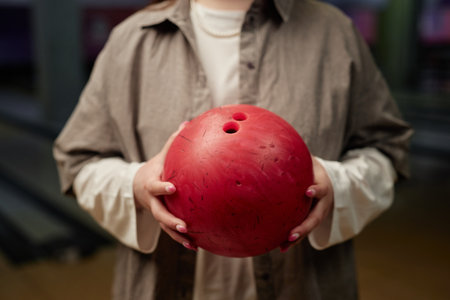 Person holding red bowling ball in bowling alley, preparing for game. Background includes bowling lanes and dark surroundings