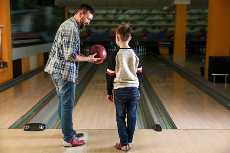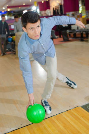 Artificial lighting. Rear particle view of man in casual clothes playing bowling in the club.