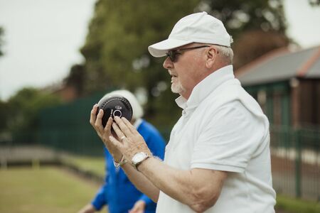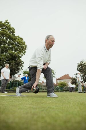 A rear view shot of a senior man taking his shot in a game of lawn bowling.
