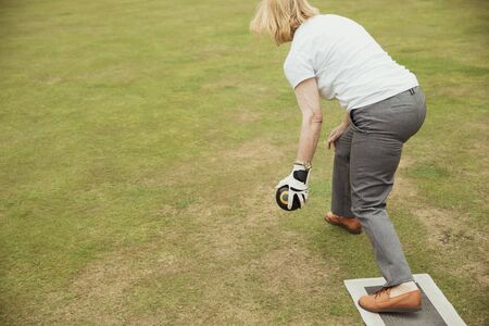 A rear view shot of a senior woman holding a bocce ball, ready to take her shot in a lawn bowling game.