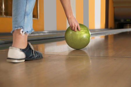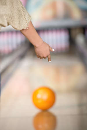 Close-up hand of woman and the ball is rolling in bowling alley.