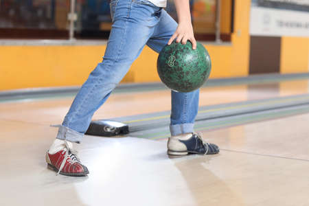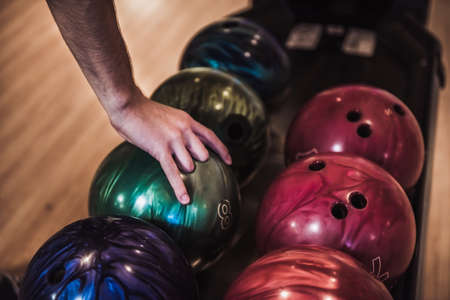 bowling balls in the sports center ready for bowling. Foot in the shoe stands on the ball