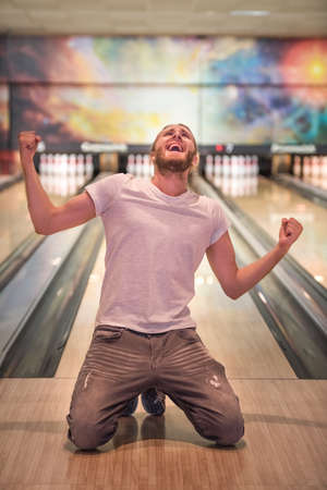 Handsome guy is raising hands in fists and smiling while standing on his knees on bowling alley