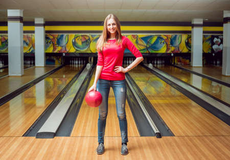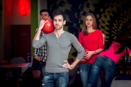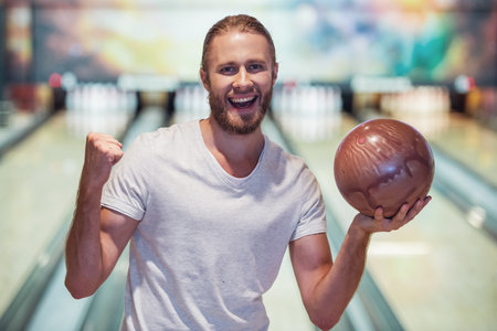 Handsome young man is holding a bowling ball, looking at camera and smiling ready to play bowling