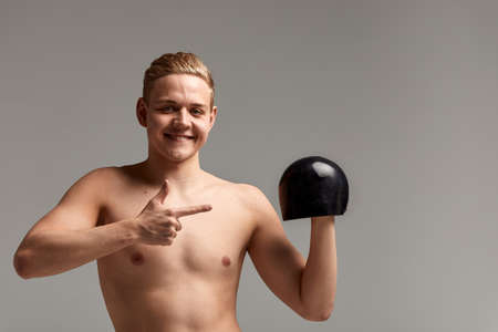 A swimmer, a young athlete in excellent physical shape, shows with his hand urging to start training, an advertising banner, a gray background, a copy of the space.