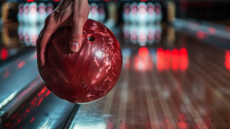 Closeup of a bowlers hand gripping a red and black bowling ball ready to make a strike