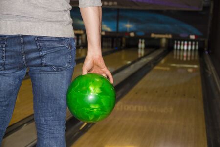 a man's hand throws a bowling ball close-up, a man plays bowling on the background of the playing field
