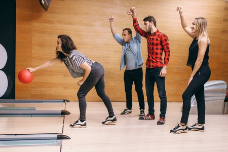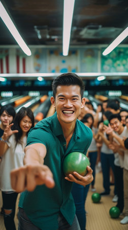 He is a winner Handsome young men throwing a bowling ball while three people cheering : Generative AI