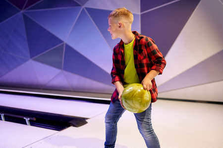 A young man prepares to bowl, showcasing excitement and anticipation in a vibrant bowling alley setting Perfect for sports and leisure themes