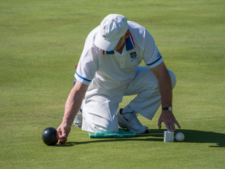 ISLE OF THORNS, SUSSEX/UK - SEPTEMBER 11 : Lawn Bowls Match at Isle of Thorns Chelwood Gate in Sussex on September 11, 2016. Unidentified man