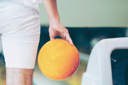 Selective focus picture of bowling ball been lifted and ready to throw by a men on isolated white background.
