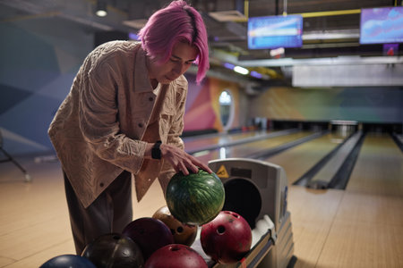 Person with pink hair in bowling alley selecting bowling ball from rack surrounded by vibrant and colorful environment with lanes in background