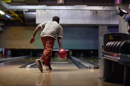 Black person enjoying evening by bowling down lane while wearing casual attire holding shining red ball aimed toward pins