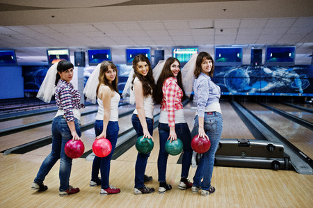 Group of six girls wit bowling balls at hen party on bowling club.