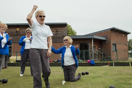 A small group of senior women celebrating during lawn bowling, with one woman punching the air.