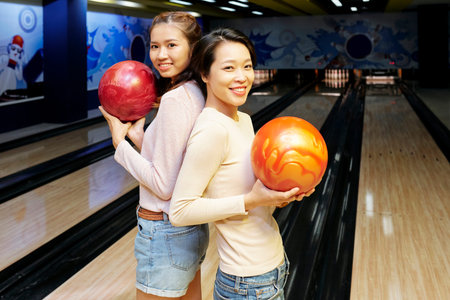 Cheerful young Vietnamese women posing with bowling balls